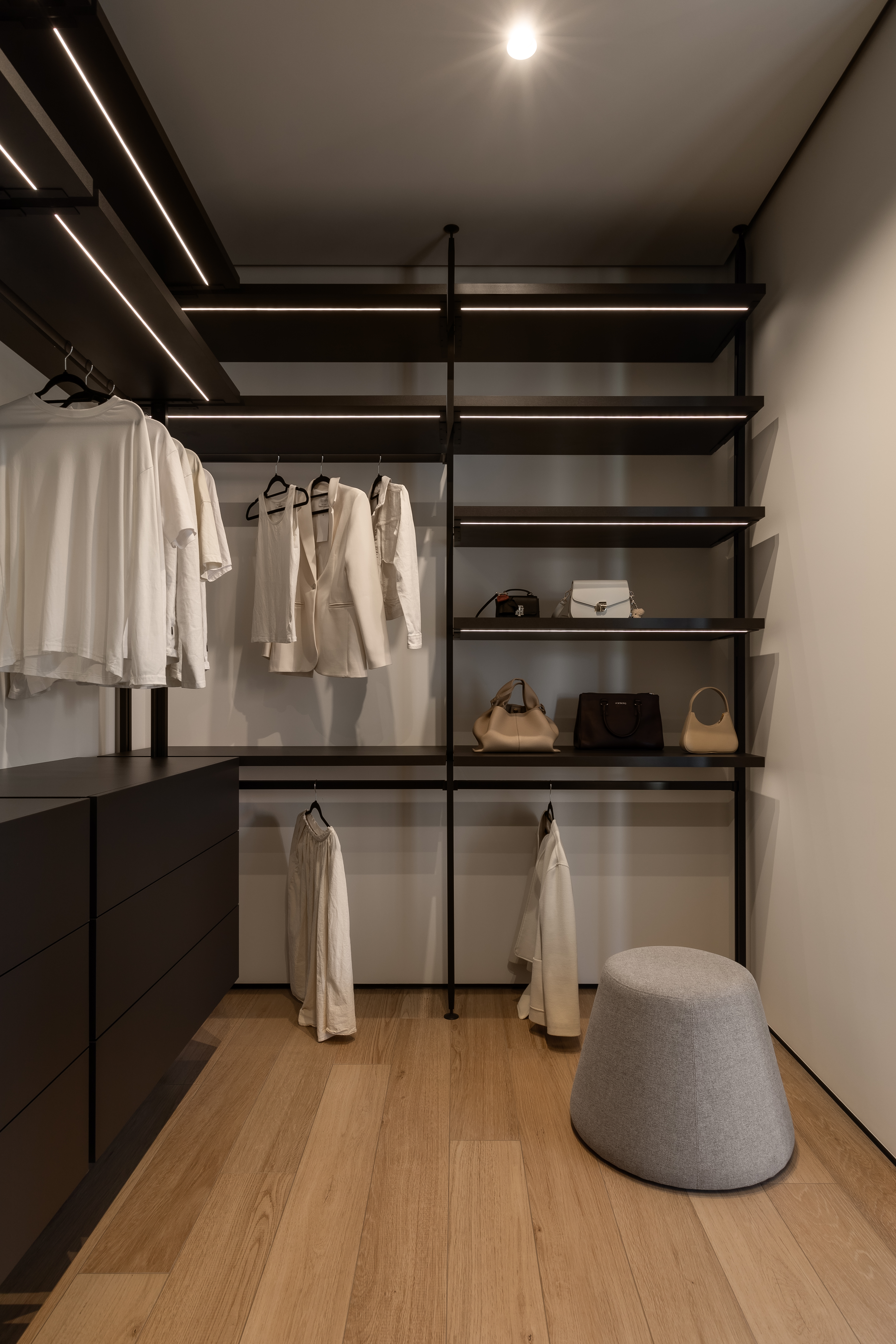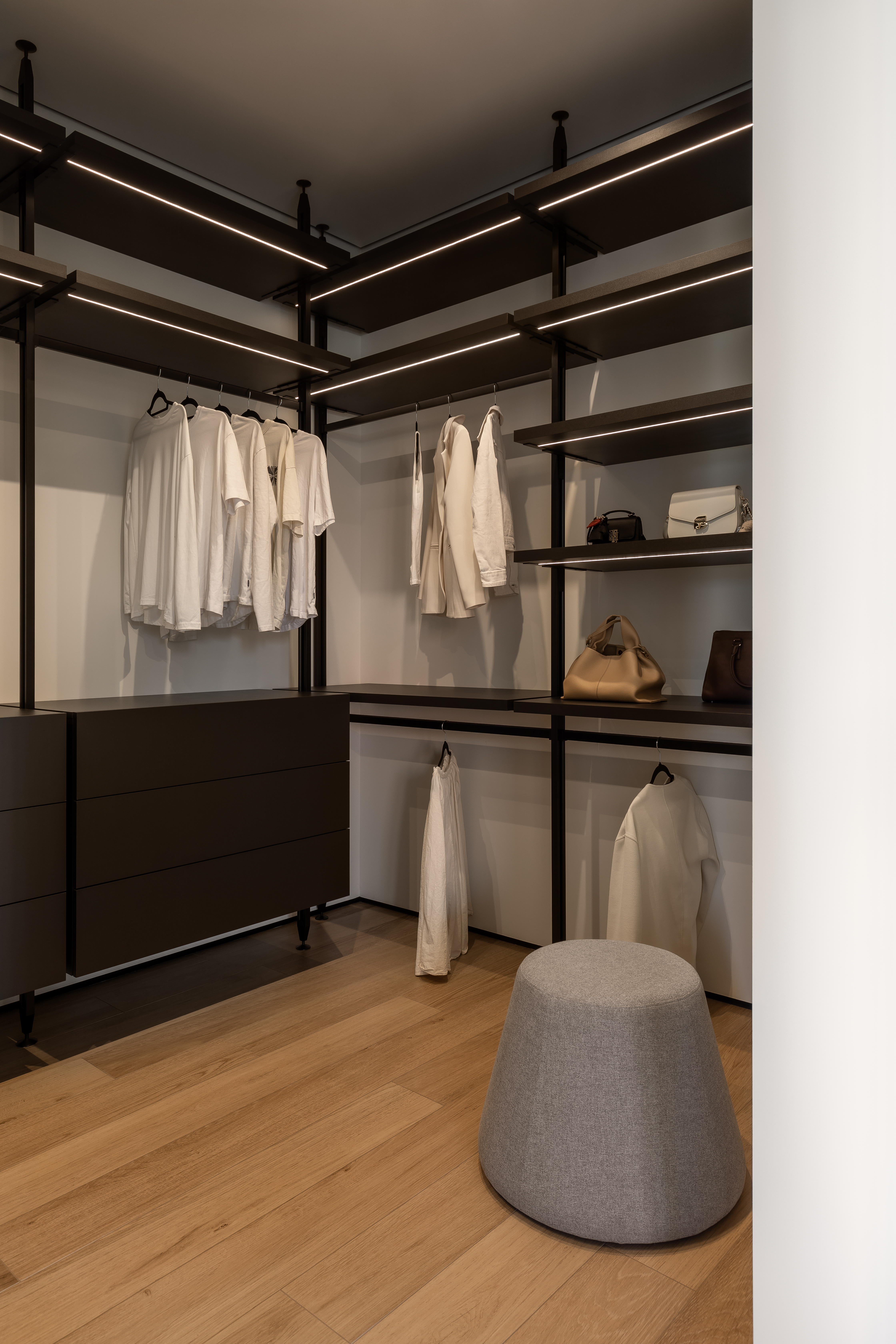 Тёплая ультратонкая неоновая подсветка подчёркивает глубину материалов, а гардеробная система Valpato Stilli в чёрном цвете завершает архитектурный образ.