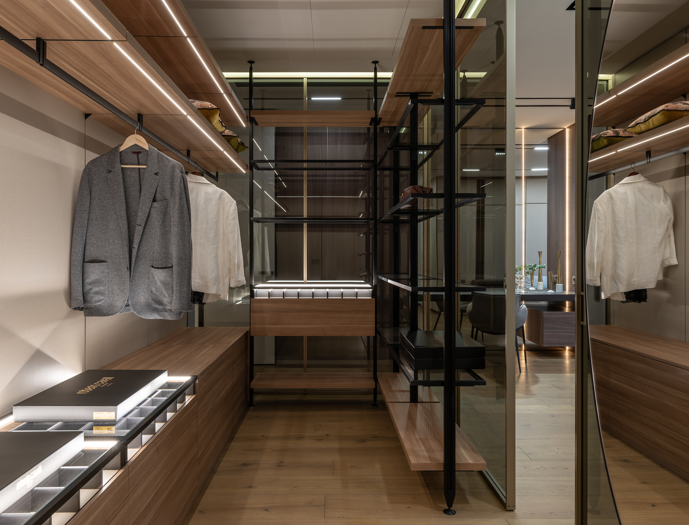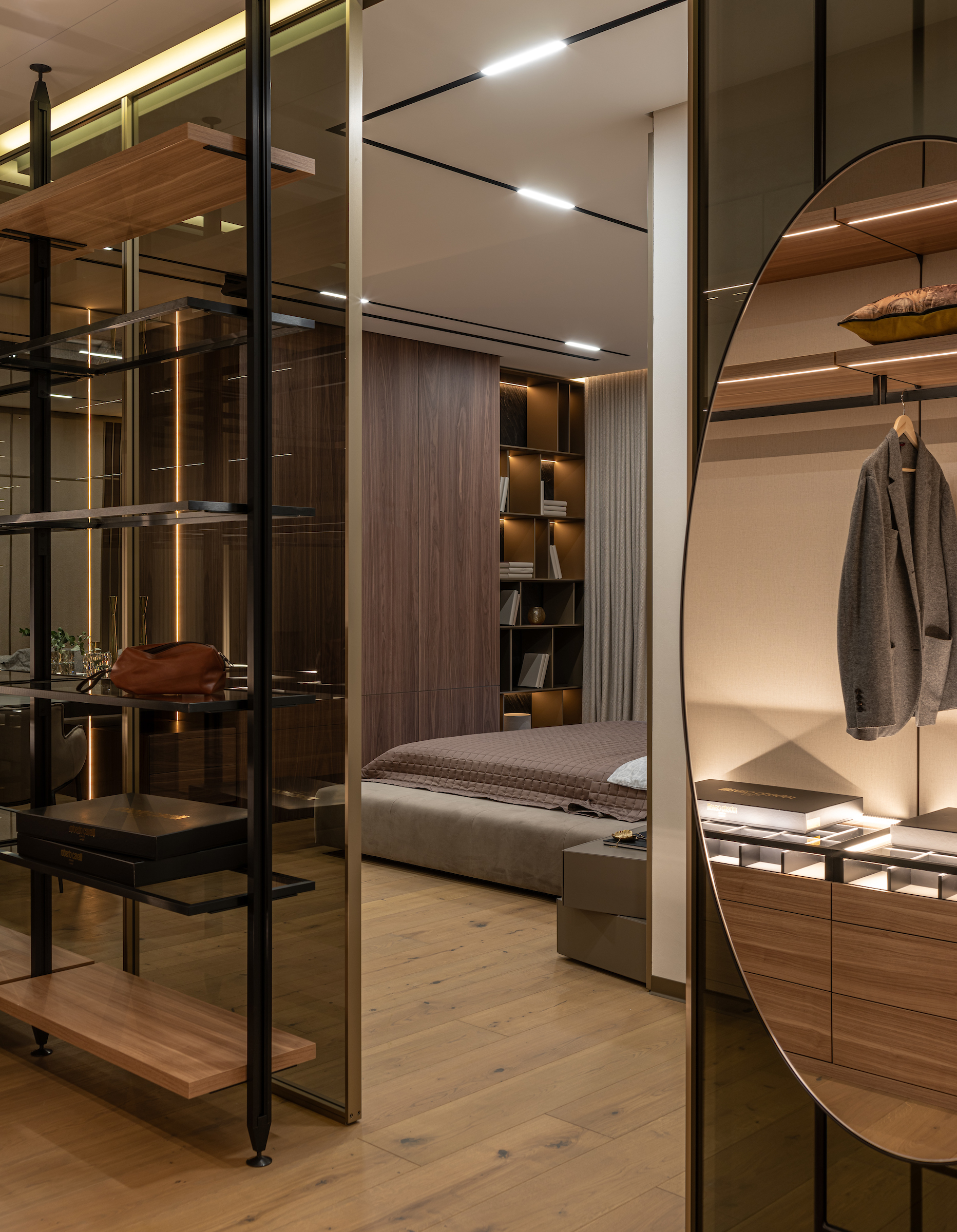 Стеклянная гардеробная комната с раздвижной системой, интегрированная в пространство мастер-спальни. Прозрачные фасады сохраняют легкость интерьера и визуально не перегружают пространство.