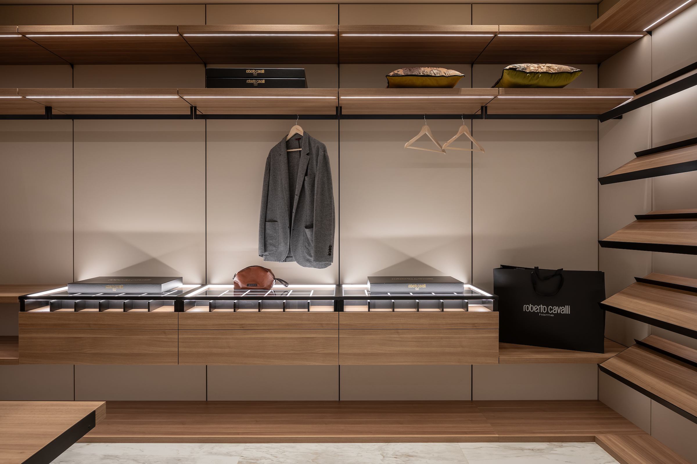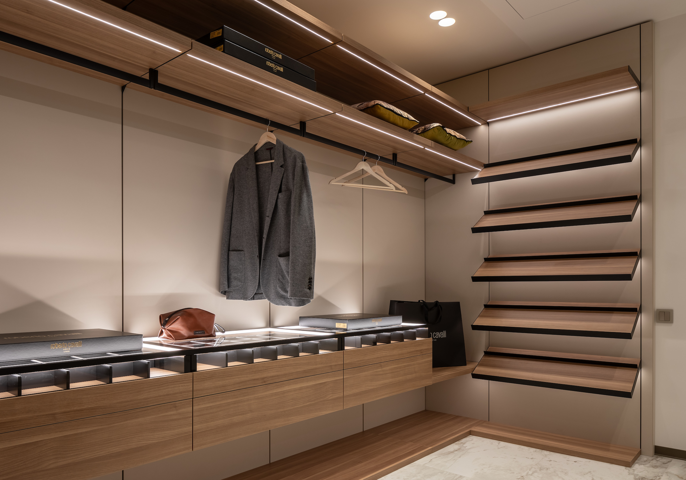 Внутри — продуманная система хранения с органайзерами для одежды, обуви и аксессуаров, большое зеркало на металлическом основании и функциональное освещение. Решение, где эстетика сочетается с ежедневным комфортом.
