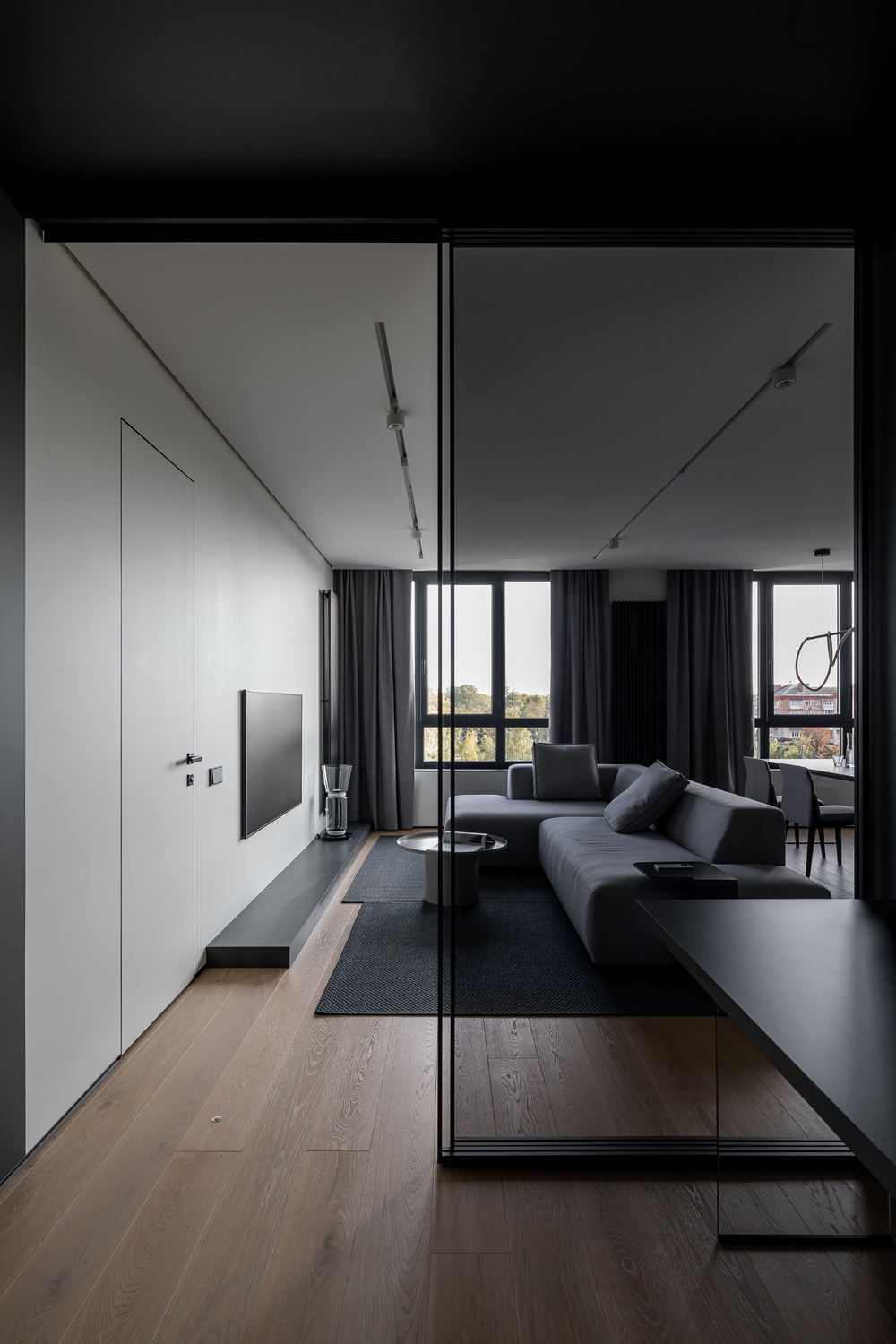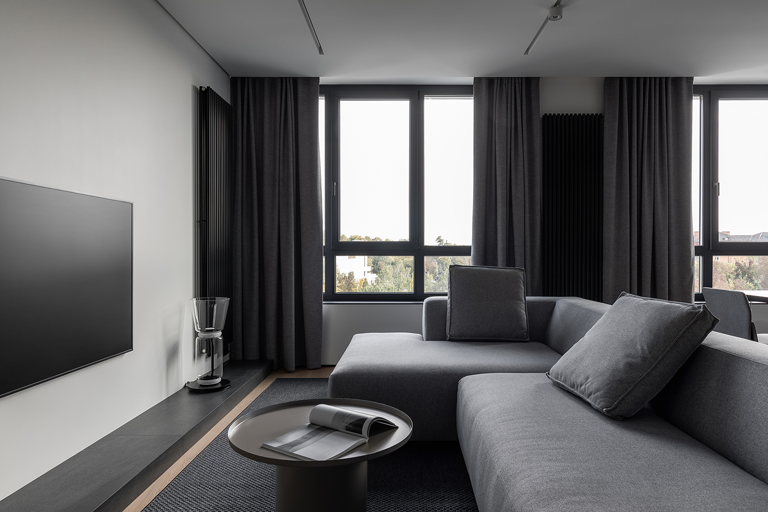 Использованы окрашенный в супермате МДФ, керамика и ДСП Soft Touch. Мягкая мебель собственного производства завершает композицию, а естественный свет усиливает ощущение объёма и пространства.