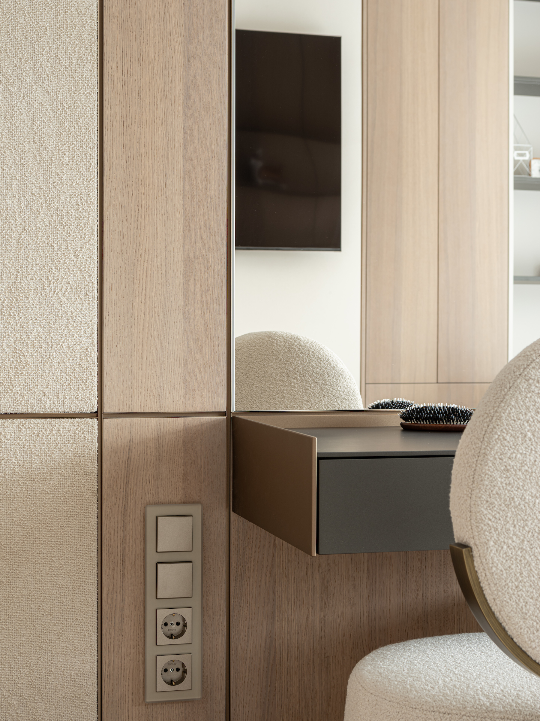 СПАЛЬНЯ, ГДЕ ФУНКЦИОНАЛ РАСКРЫВАЕТСЯ ЧЕРЕЗ ИНТЕГРАЦИЮ И ДЕТАЛЬ. ТКАНЕВЫЕ СТЕНОВЫЕ ПАНЕЛИ ОБЪЕДИНЕНЫ СО ШПОНИРОВАННЫМИ И ДОПОЛНЕНЫ АЛЮМИНИЕВЫМ ПРОФИЛЕМ С ТОНКИМИ МЕТАЛЛИЧЕСКИМИ ПОЛКАМИ.
