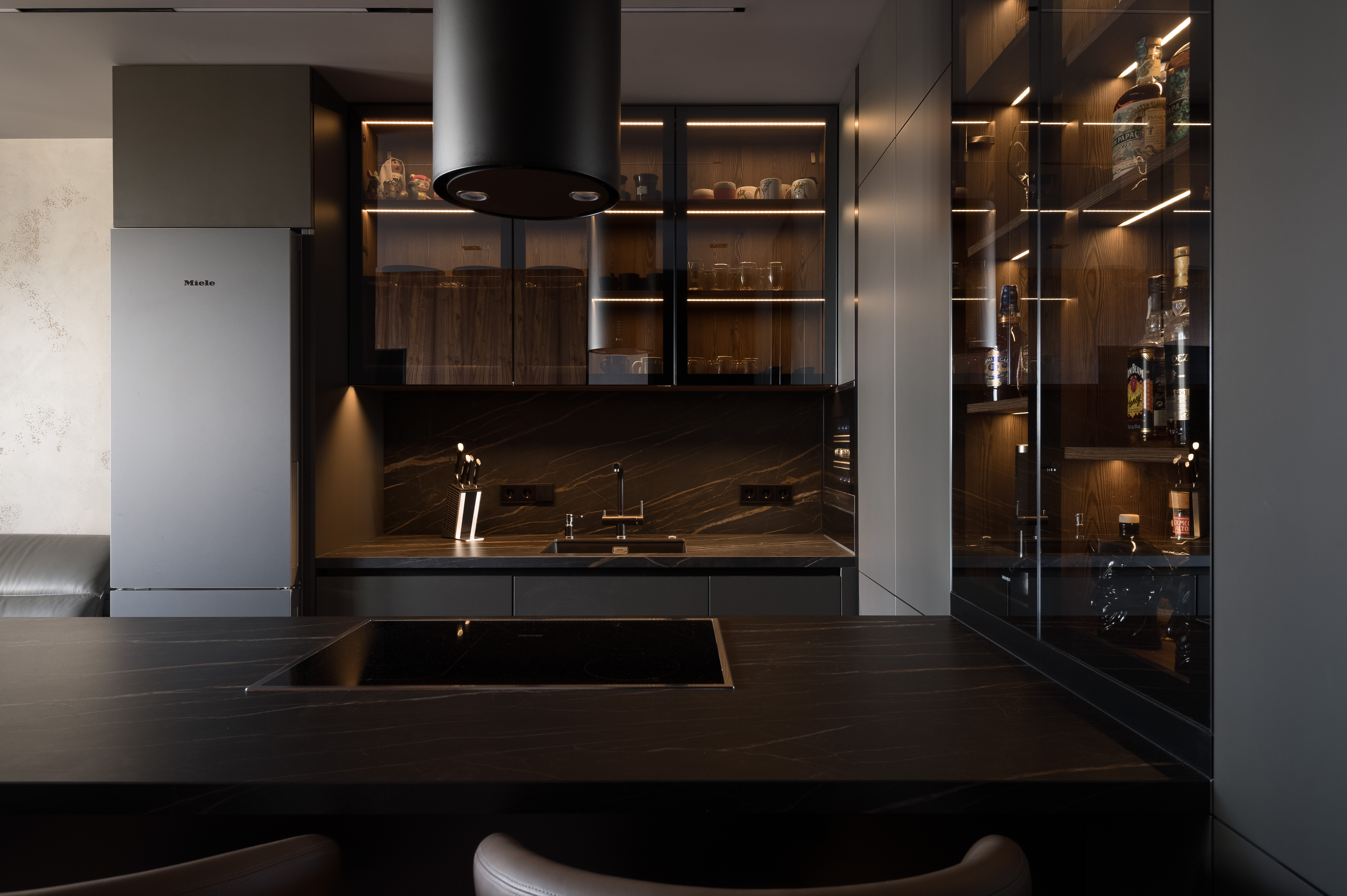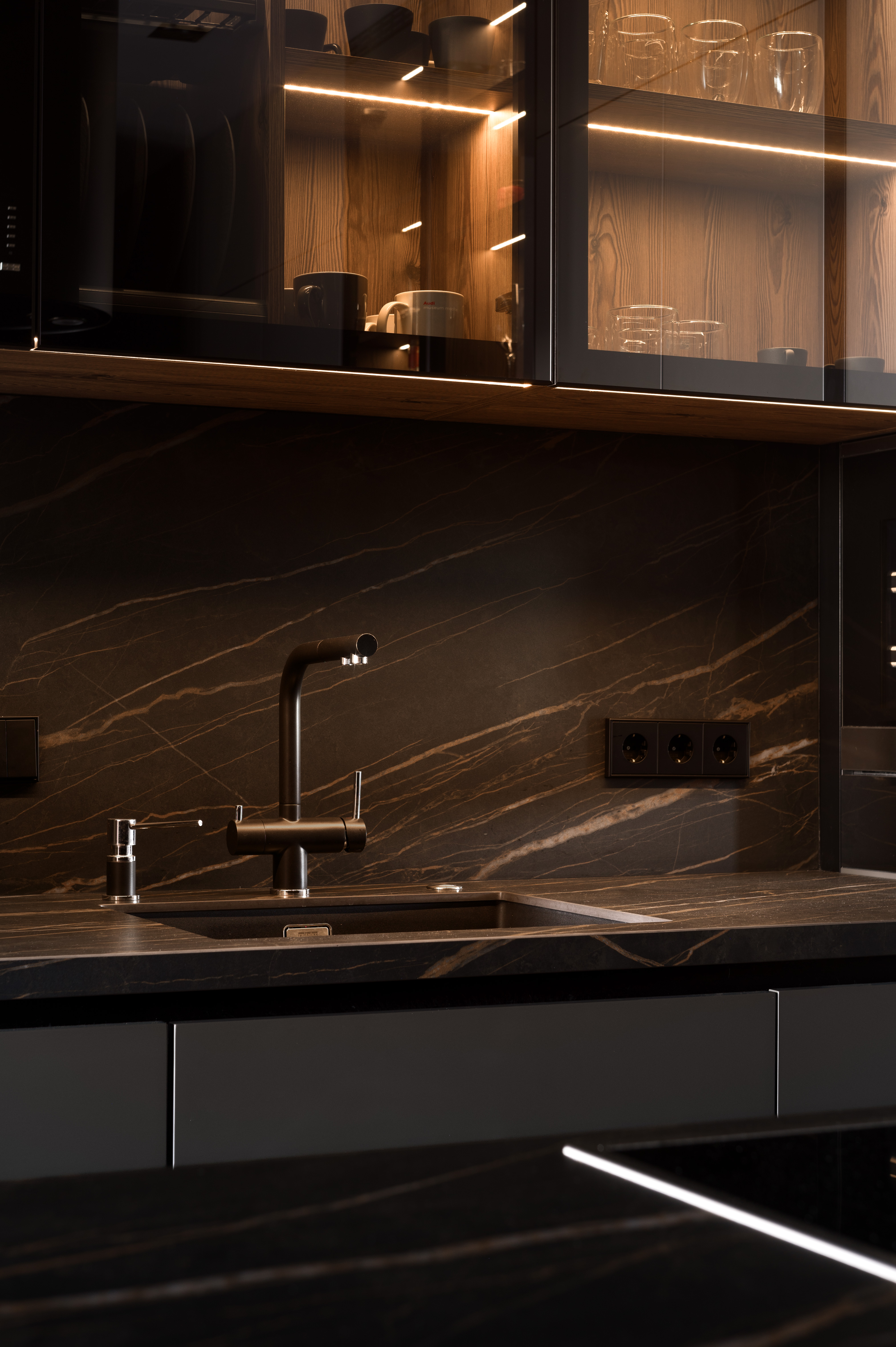 • LED-підсвітка над робочою поверхнею кухні та на полицях за скляними фасадами