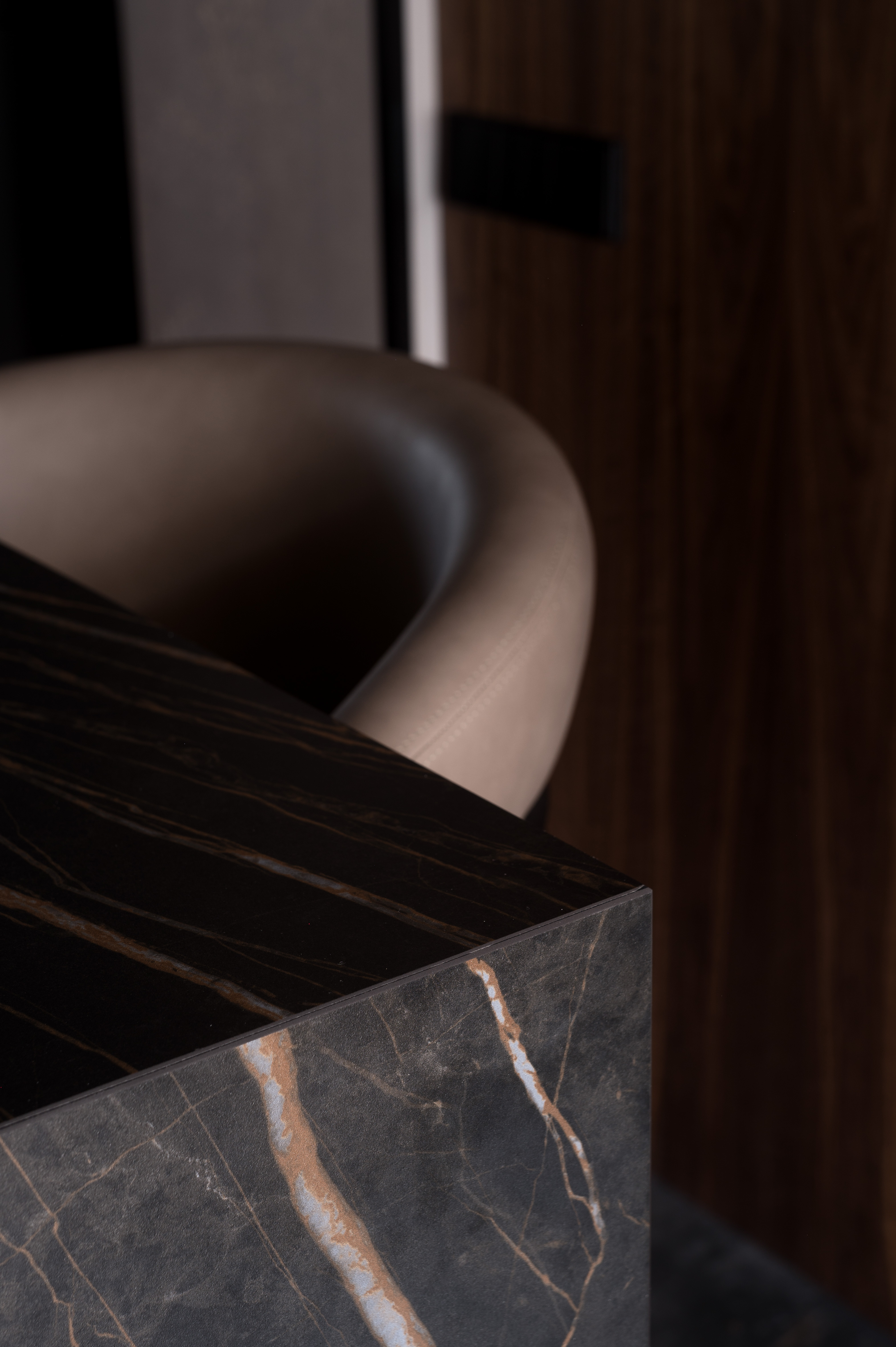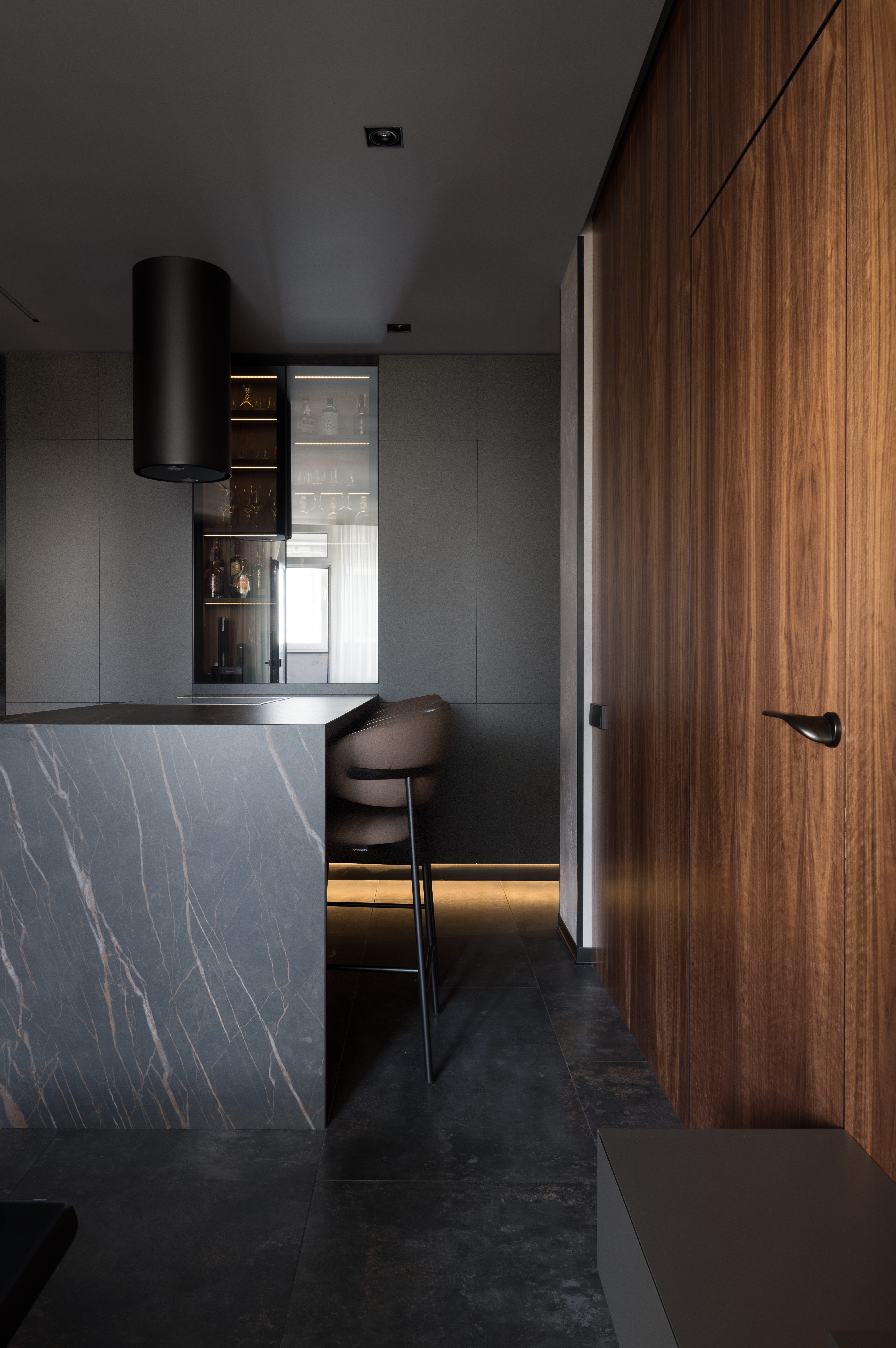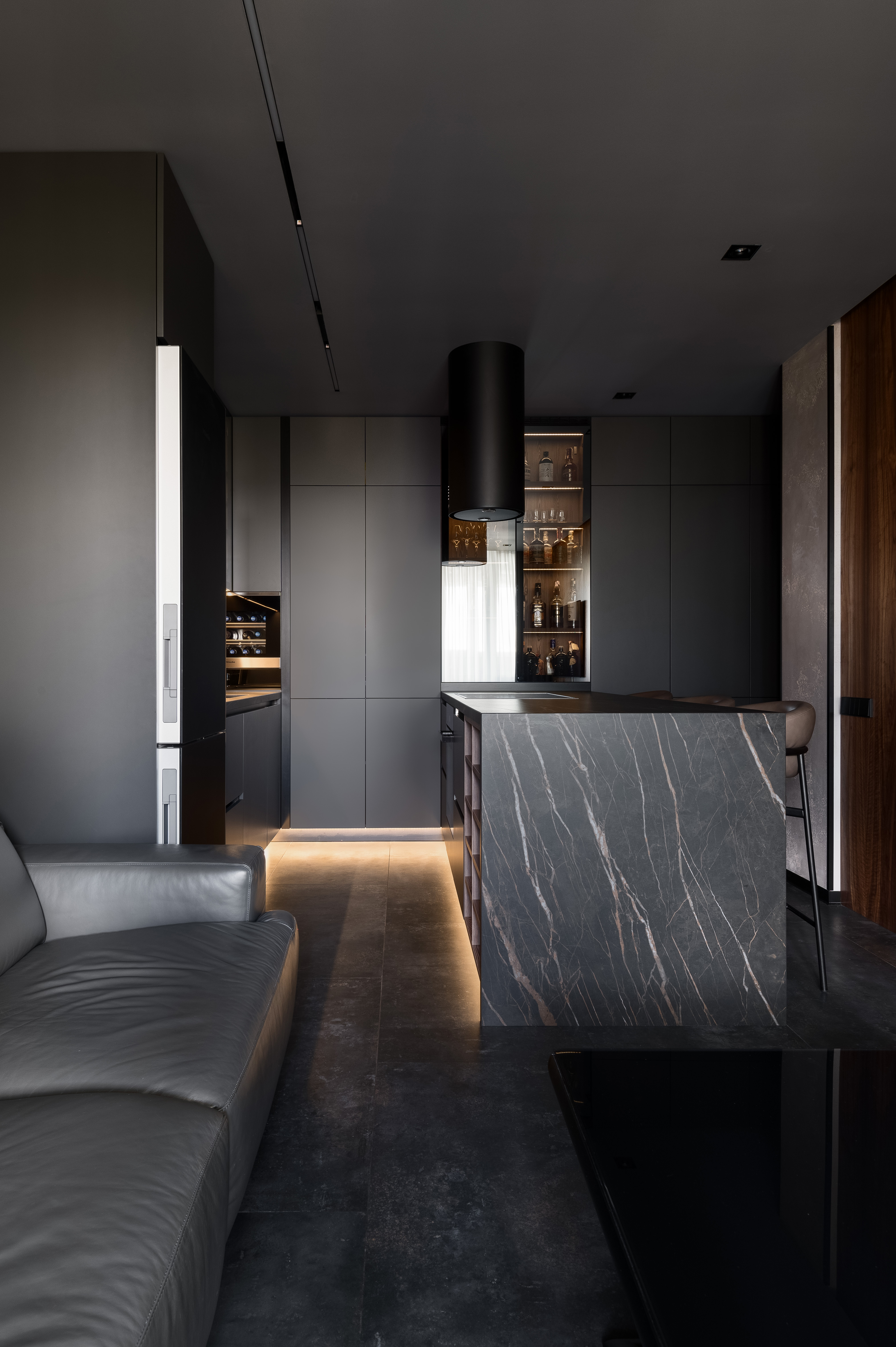 Це простора кухня прямої форми з островом, обідньою зоною та величезною кількістю зберігання. Вийшло влучне поєднання сучасного стилю та ергономіки.