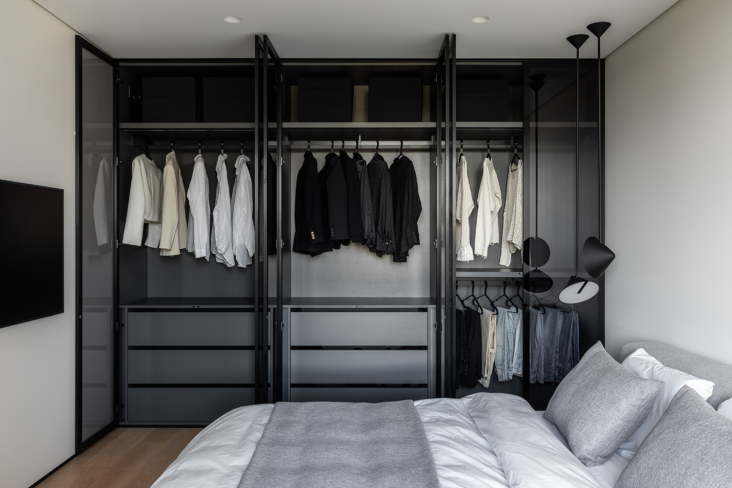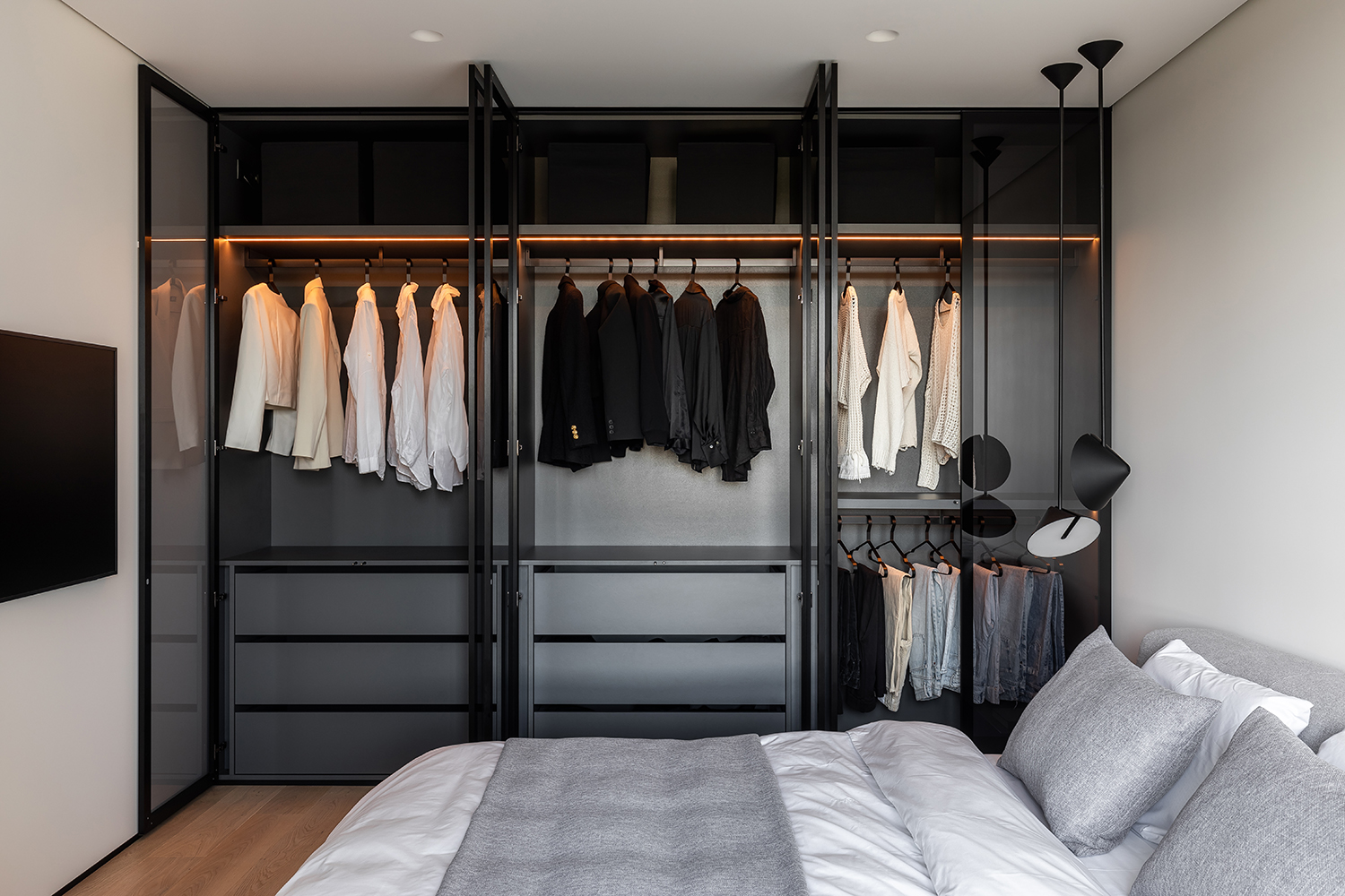 Просторный шкаф с графитовым стеклом и акцентной подсветкой